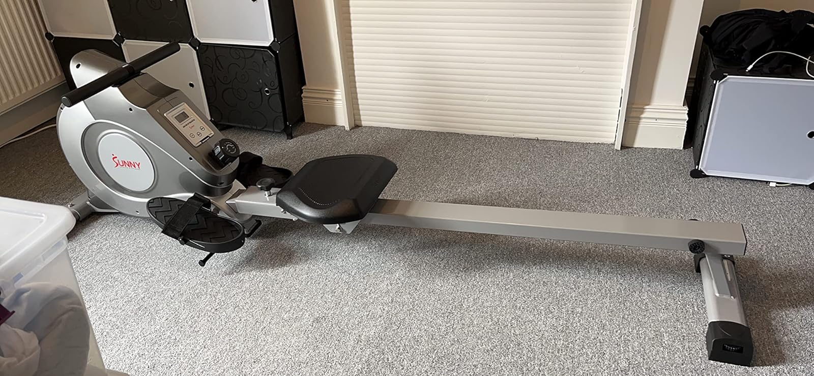 The Sunny is a solid, well-designed, well-built device. It uses magnetic rather than air resistance, which has the advantage of being almost silent during use. The resistance is adjustable and in my view the range should be more than adequate for anyone except perhaps a national team heavyweight rower. The seat moves smoothly up and down the rail; the mechanism uses a fiberglass belt rather than a bicycle chain. It doesn't appear that any maintenance other than occasional cleaning, and lubricating the seat, will be necessary. The computer measures number of strokes per workout, elapsed time, total strokes and calories burned. (The latter is probably not very reliable.) A scan function that automatically changes data functions every three or four seconds is also provided. The foot rests with Velcro straps should work well regardless of the user's foot size. The rower can be moved from one room to another using wheels built in to the forward cross bar, and the main strut folds to vertical for storage, with the removal of two bolts (no tools needed).