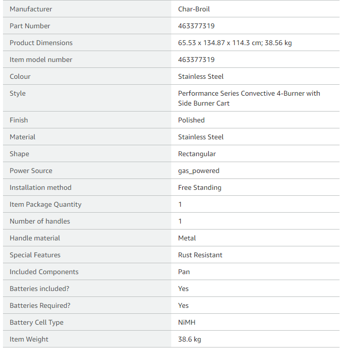 - SIDE SHELF: A large side shelf provides ample space to set plates, tools, sauces and rubs while you grill.