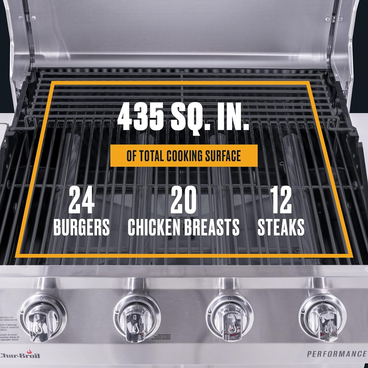 - COOKING AREA: Grill up to 24 burgers, 20 chicken breasts or 12 steaks on 475-square-inches of primary cooking space. Cook meats and larger items on the primary grates and use the 130-square inch warming rack to cook with indirect heat and keep food warm.