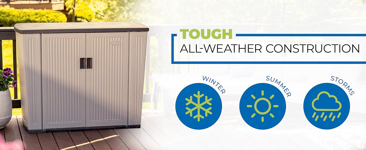 Needed a weatherproof outdoor cabinet large enough to house a mini fridge for around the pool. This is one of the few that fit the dimensions we needed and has an opening rear flap for a power cord/venting. Packaging is decent, but due to the material, not much additional padding of the shipping container was used. None of the parts were damaged. Its a fairly simple assembly with most pieces interlocking together on their own and held in place with some small screws. This has a shelf, but I did not install it due to the fridge. Easy to move into place once assembled and feels ready for the north florida weather. Love the space for the fridge and extra room for other deck items when needed. Solid Suncast resin build.