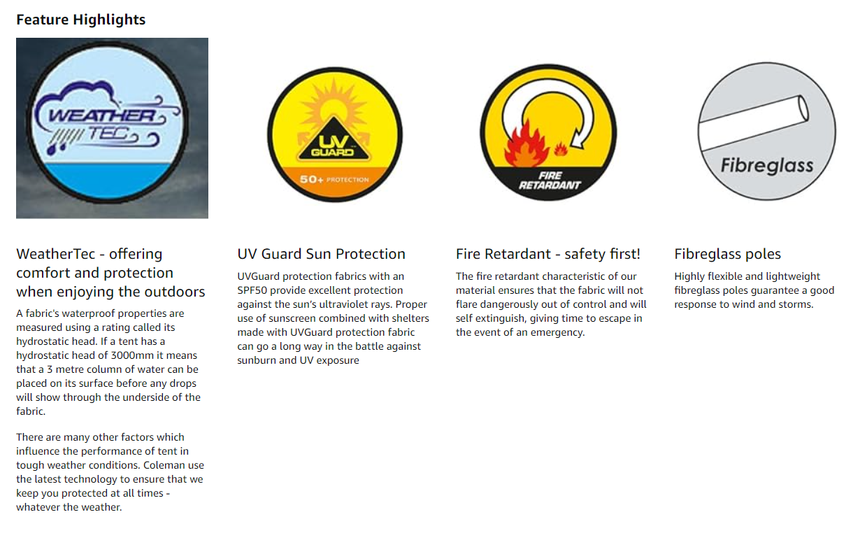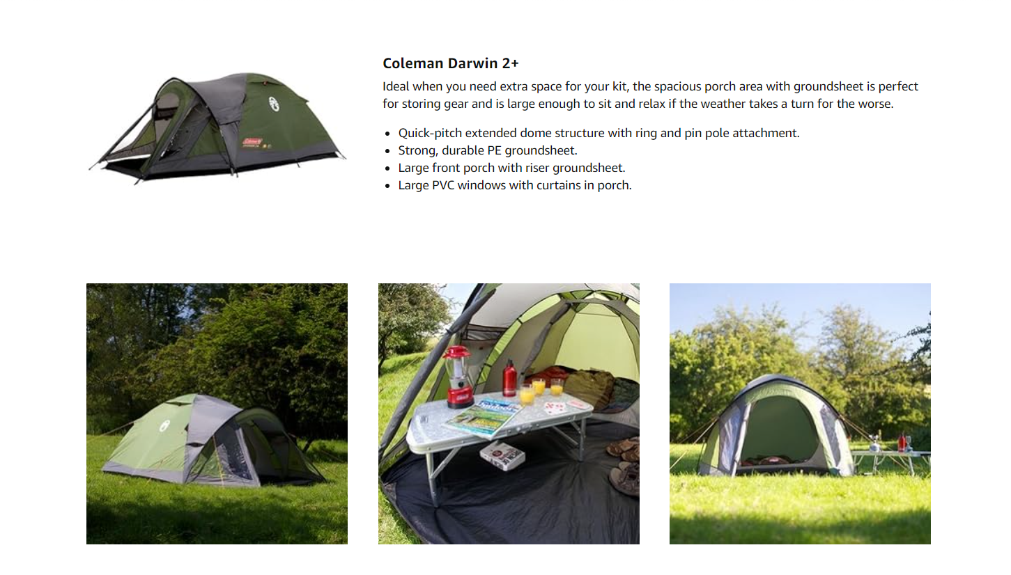 Age range Adult Color Green Size 4 Persons Hand orientation Right Style Darwin 4 Plus Height 140 centimetres Item display width 280 centimetres Shape Round Material type Polyester Seasons Evergreen Features Waterproof Sport Camping & Hiking Included components Tent Batteries included? No Brand Coleman Department Unisex Manufacturer Coleman Item model number 2000012150 Product Dimensions 340 x 280 x 140 cm; 6.15 kg ASIN B00BM7A2IU