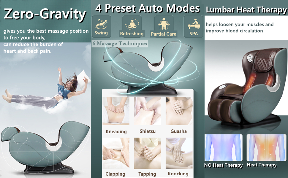- 【6 Massage Techniques & 4 Auto Modes】Meet different massage needs: The SL massage chair zero gravity with 4 preset auto modes: Swing, Refreshing, Partial Care, SPA; 6 massage techniques: Kneading, Shiatsu, Guasha, Clapping, Tapping, Knocking