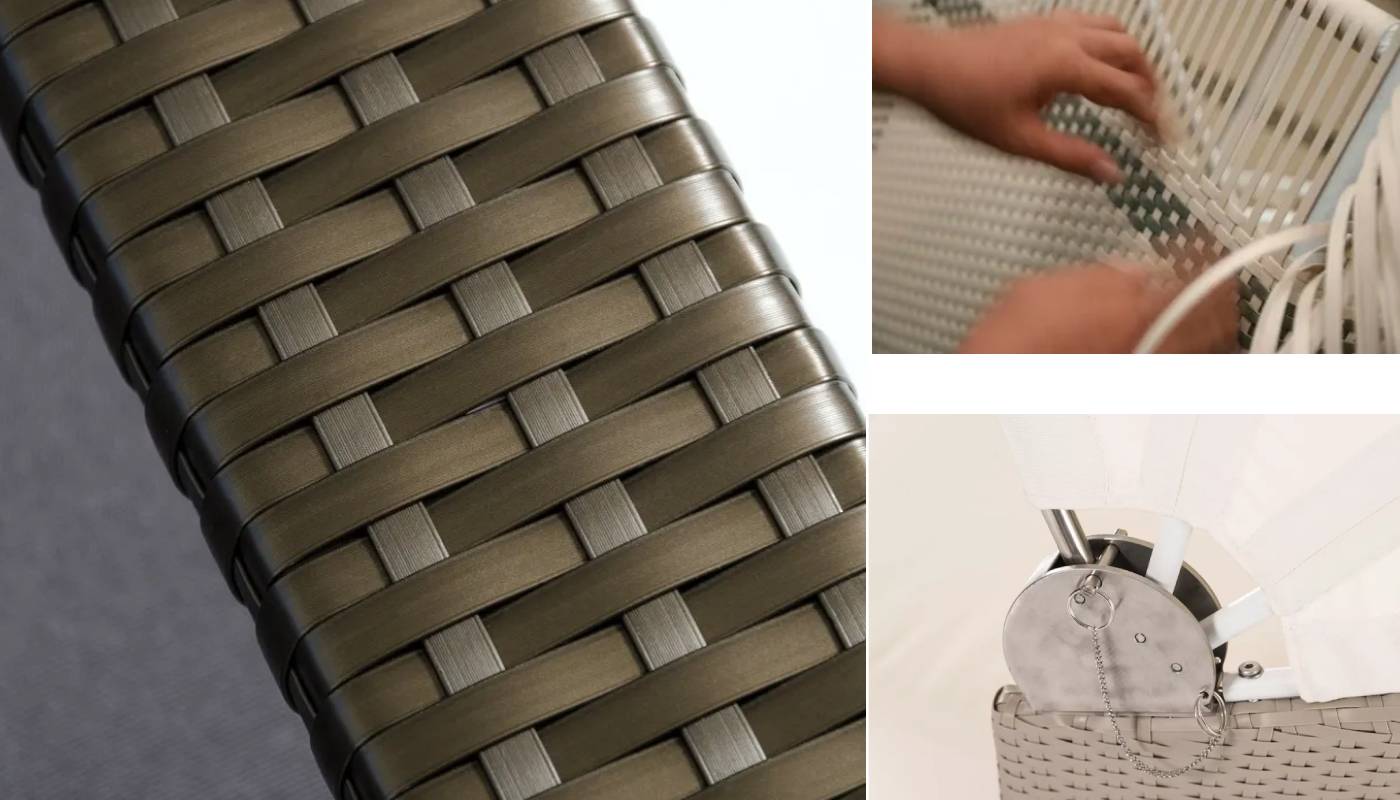 Our 1.8m x 100cm wide oval table has an aluminium frame with rattan weave worked around all the pieces and beautifully fused together to form a pleasing but very