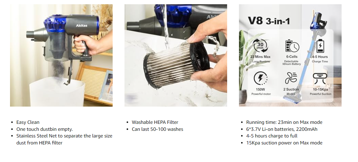 Brand Akitas Model Number AKV8 Colour Blue Product Dimensions 28 x 15 x 68 cm; 2.4 kg Capacity 1.2 litres Power / Wattage 150 watts Number of Speeds 2 Carpet Cleaning Performance Class A Hard Floor Cleaning Performance Class A Dust Re-emission Class A Noise Level 67 dB Runtime 40 minutes Special Features cordless, Headlight, Bagless, Washable Filter Item Weight 2.4 kg